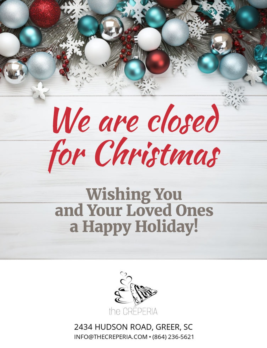 Christmas Eve we'll be open and Christmas day we'll be closed. Happy Holidays